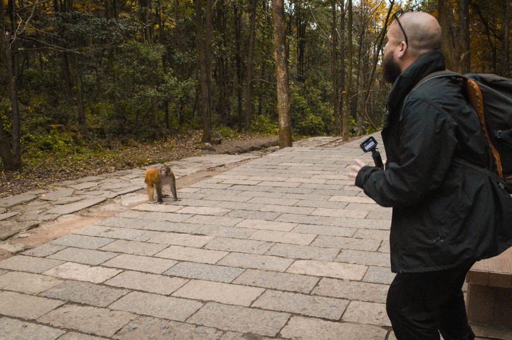 O ponto final da caminhada é em uma parada de ônibus chamada “Water Winding Four Gates”, onde voltamos a encontrar os grupos de turistas e os macacos.